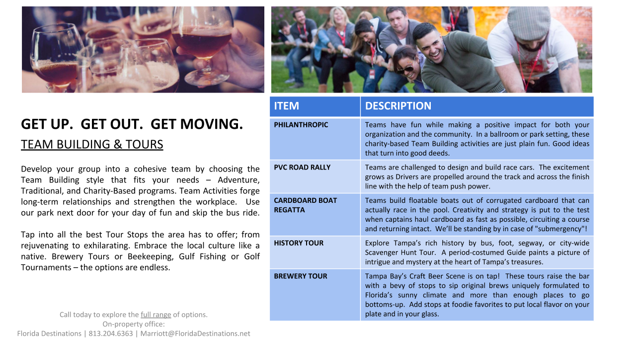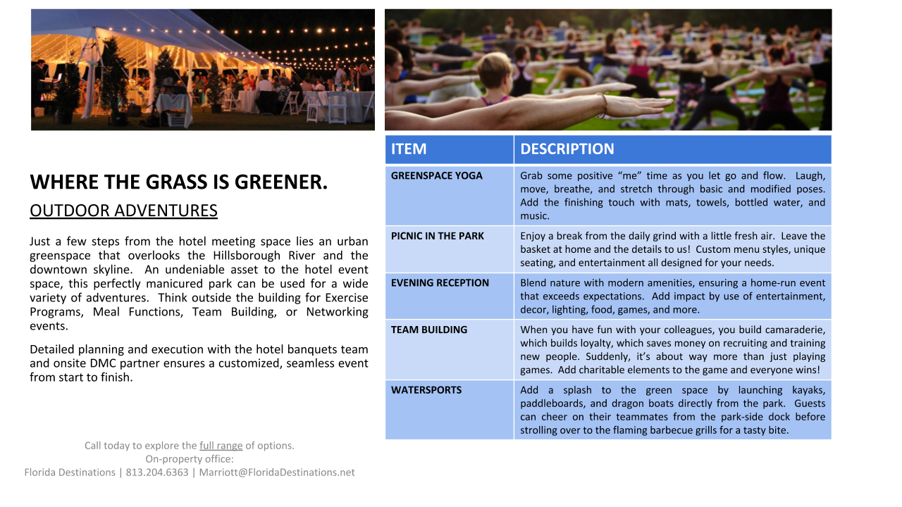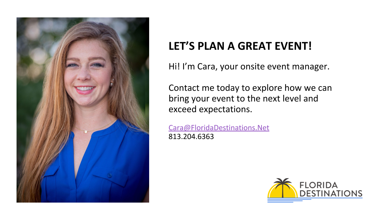 For over 17 years, Florida Destinations has held an office onsite at the Marriott Tampa Waterside. Marriott is selective in choosing partners that offer the same flawless service synonymous with the Marriott brand. This partnership ensures excellence and peace of mind during every phase of your meeting.