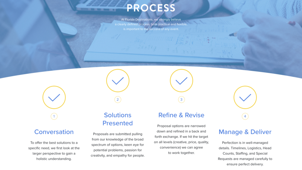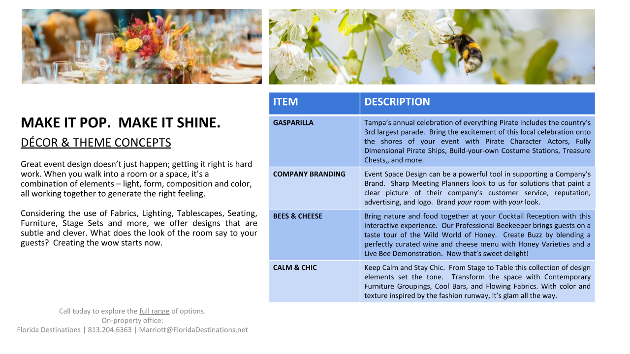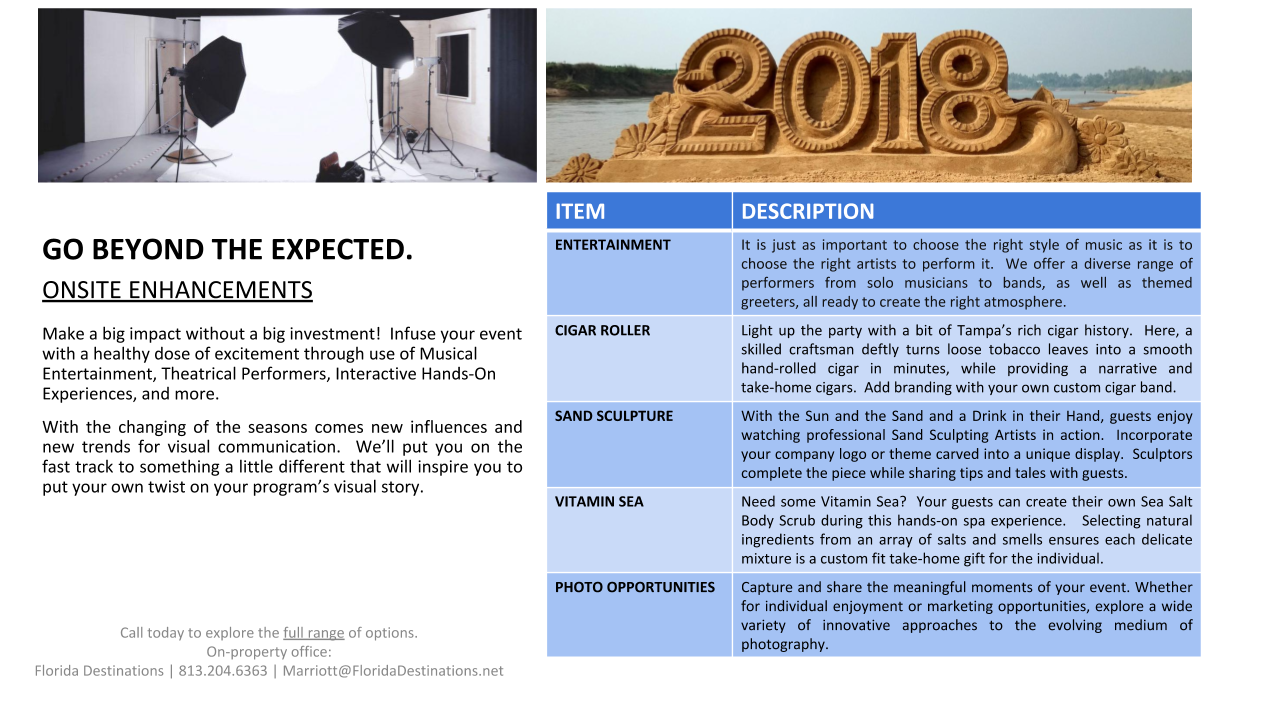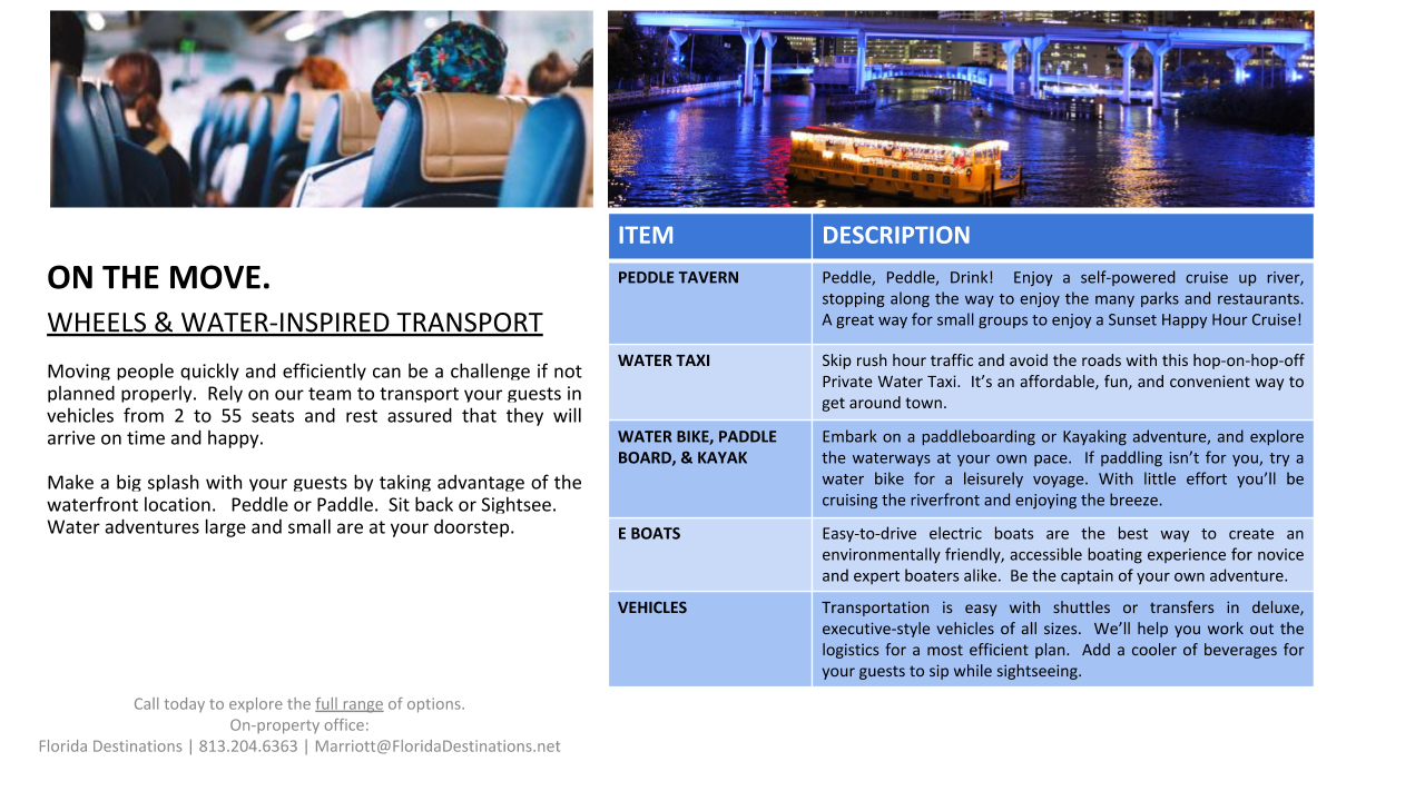 For over 17 years, Florida Destinations has held an office onsite at the Marriott Tampa Waterside. Marriott is selective in choosing partners that offer the same flawless service synonymous with the Marriott brand. This partnership ensures excellence and peace of mind during every phase of your meeting.